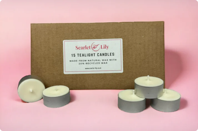 Our hand poured tealight candles are poured in small batches in our East Yorkshire workshop using natural vegetable wax with 20% recycled wax which has been returned through our wax recycling scheme.