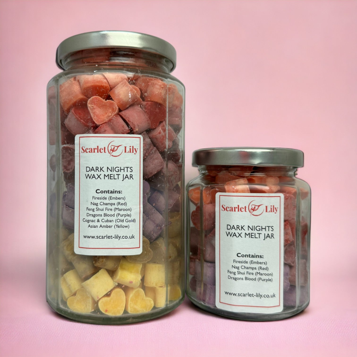 The large dark nights jar contains all of the above fragrances plus Cognac & Cuban (Old Gold) and Asian Amber (Yellow).