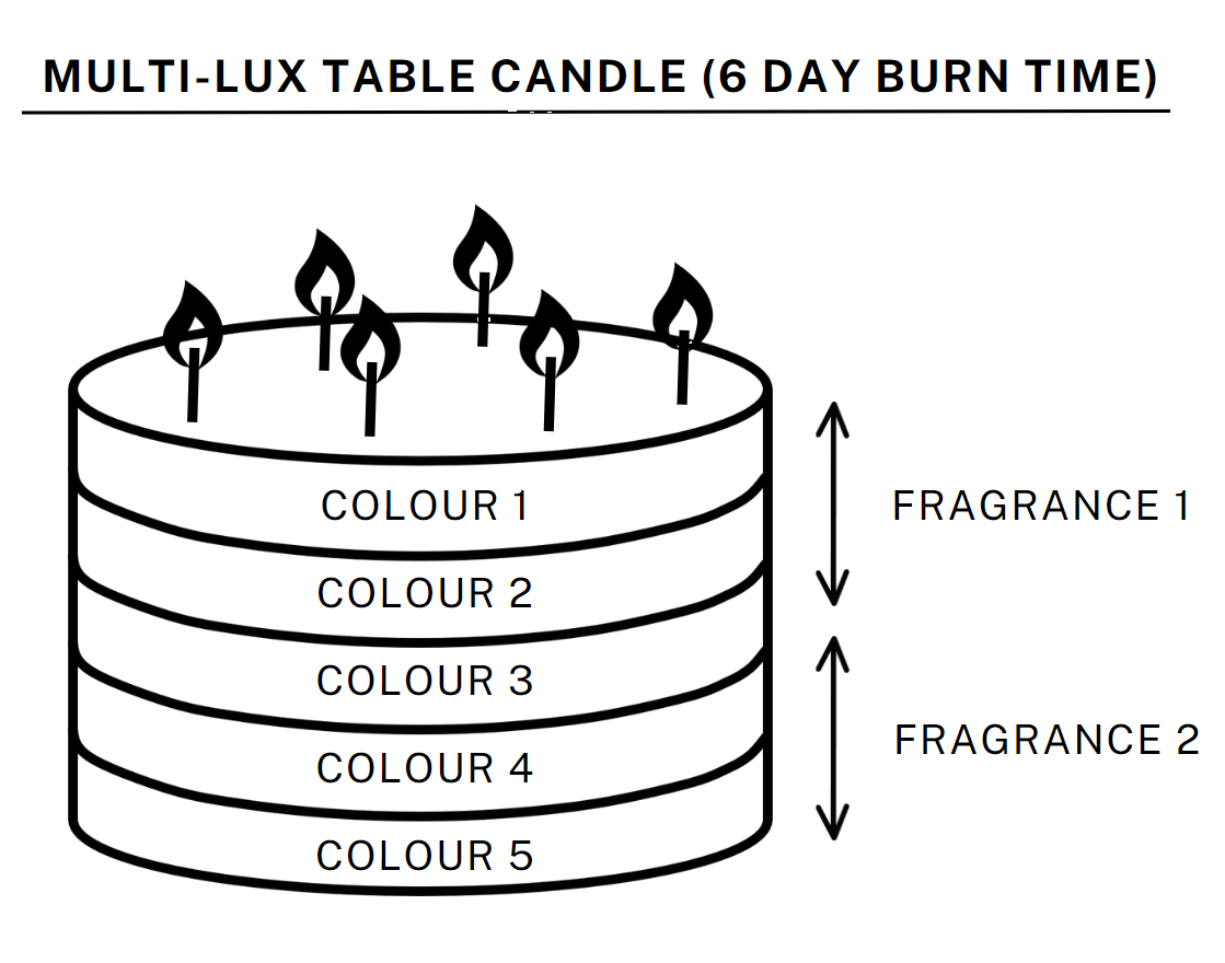 Our Multi-Lux table candles are a fantastic decoration or centre piece for your home. Completely customisable, you can choose from 50 colours, and up to 2 fragrances from our 150+ available fragrances. 144 hour burn time.