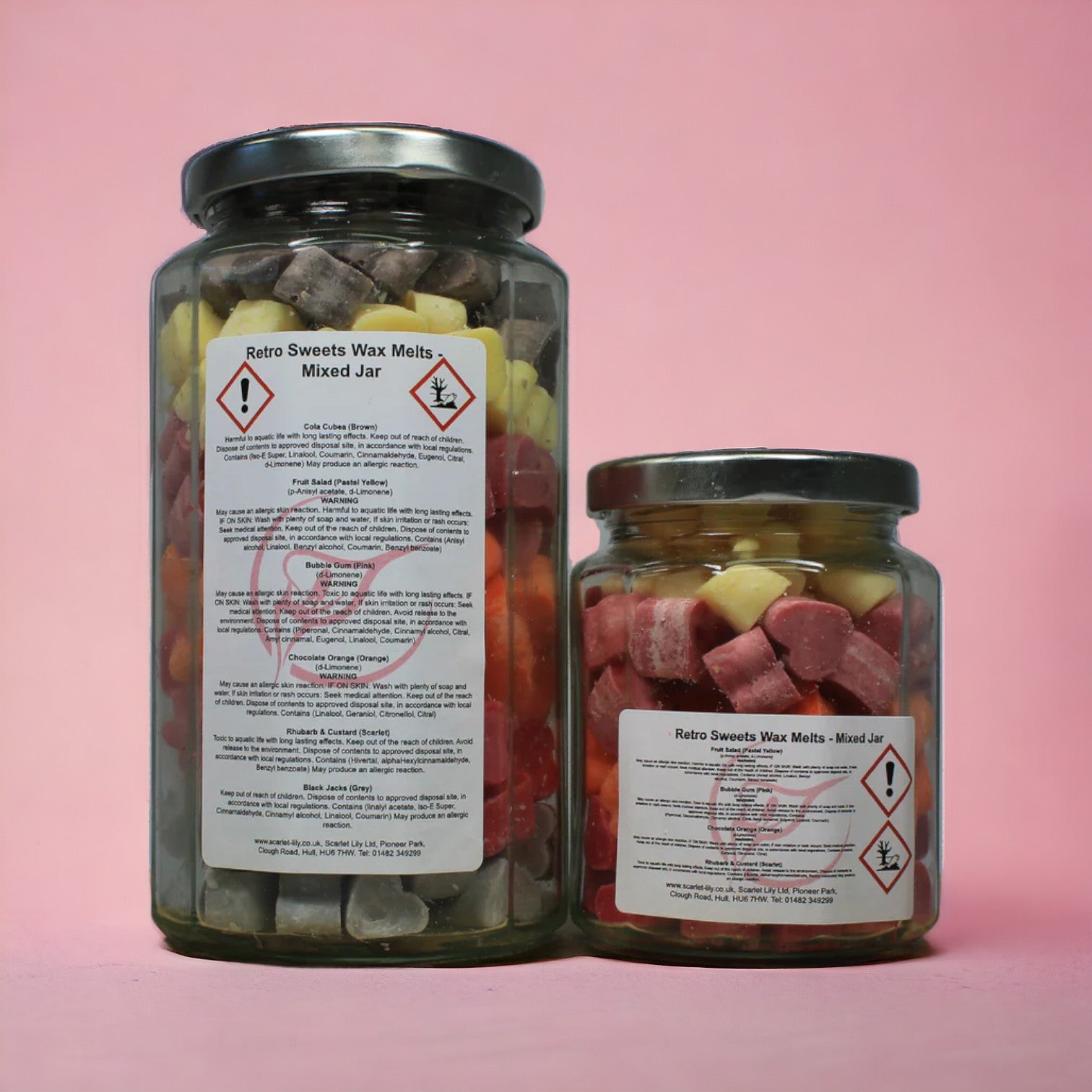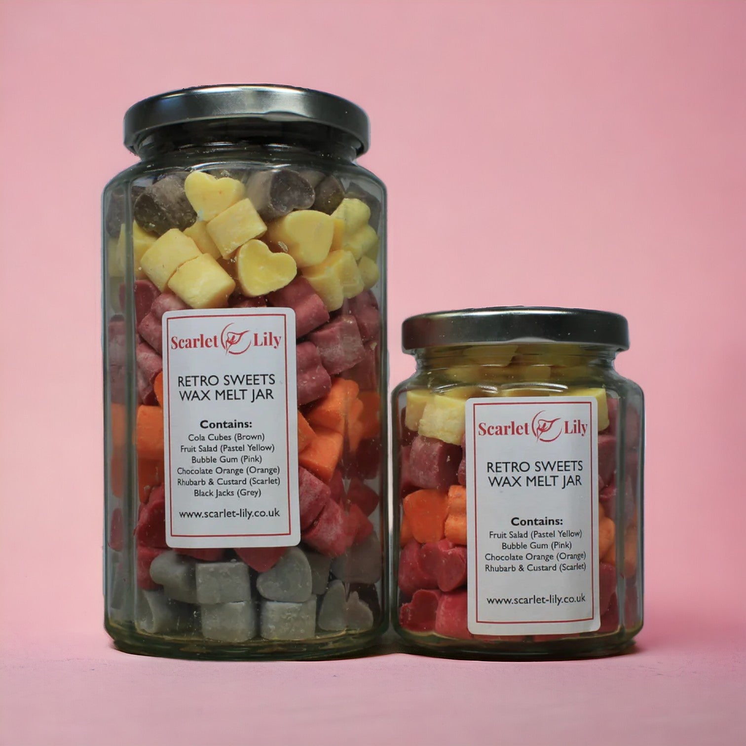 The large retro sweets jar contains all of the above fragrances plus Black Jacks (Grey) and Cola Cubes (Brown).