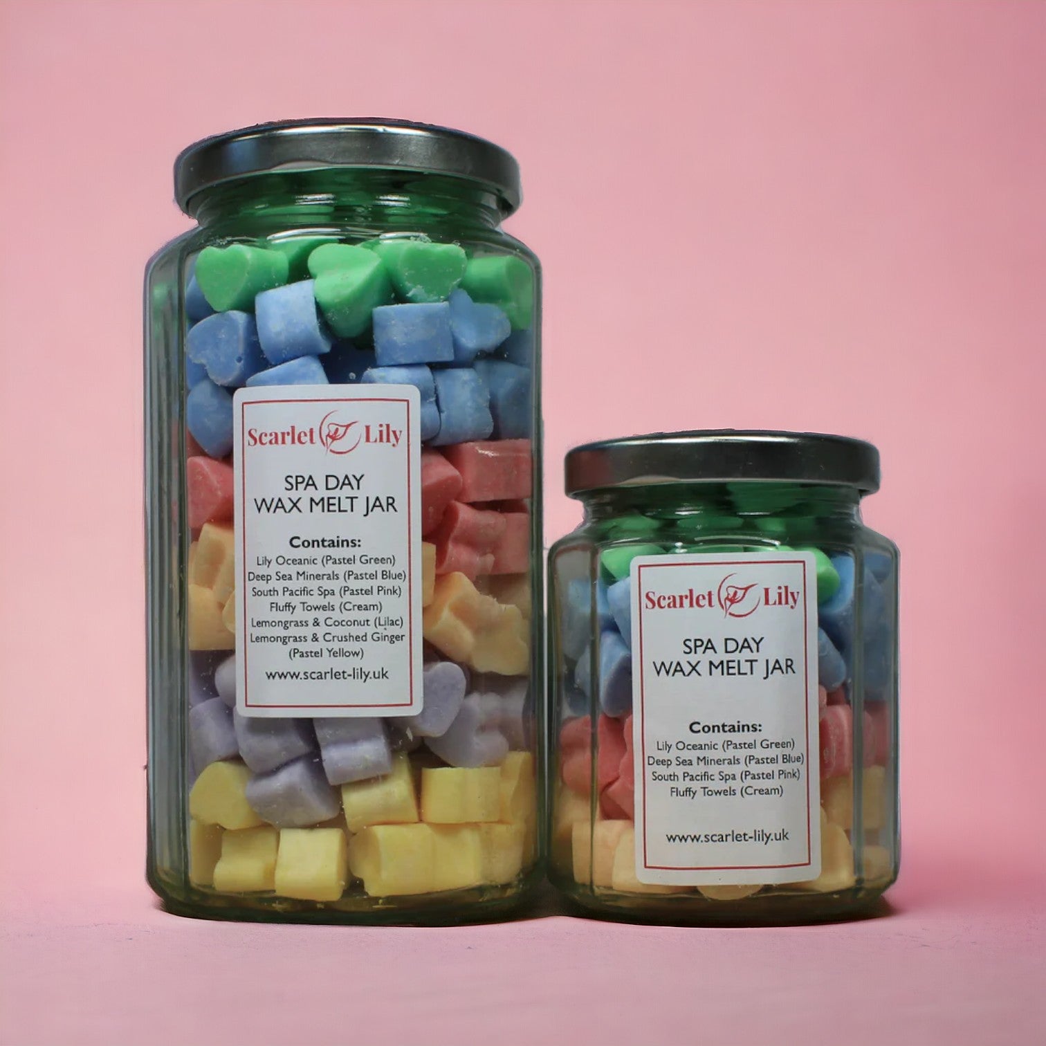The large spa day jar contains all of the above fragrances plus Lemongrass & Coconut (Lilac) and Lemongrass & Crushed Ginger (Pastel Yellow).