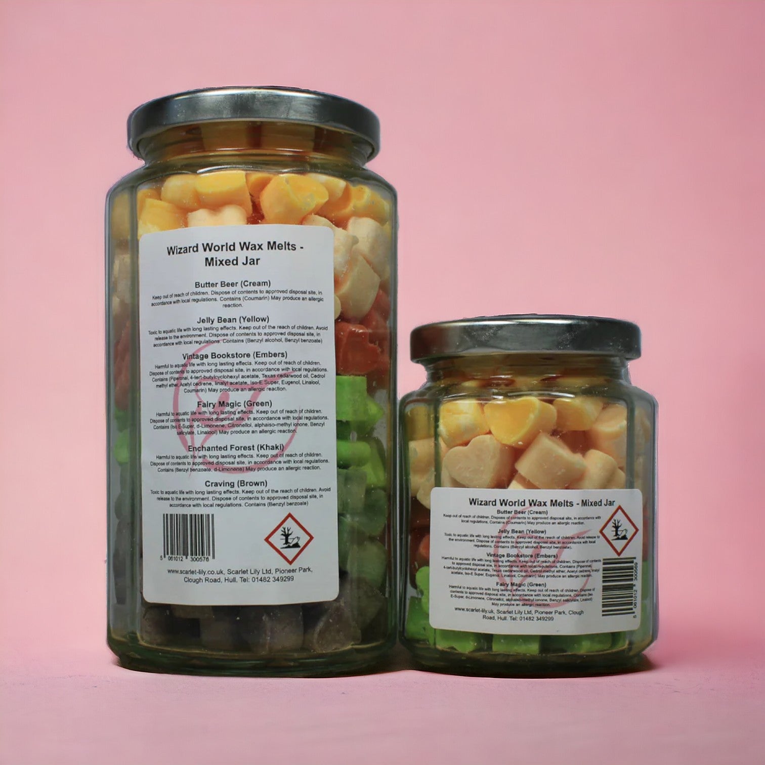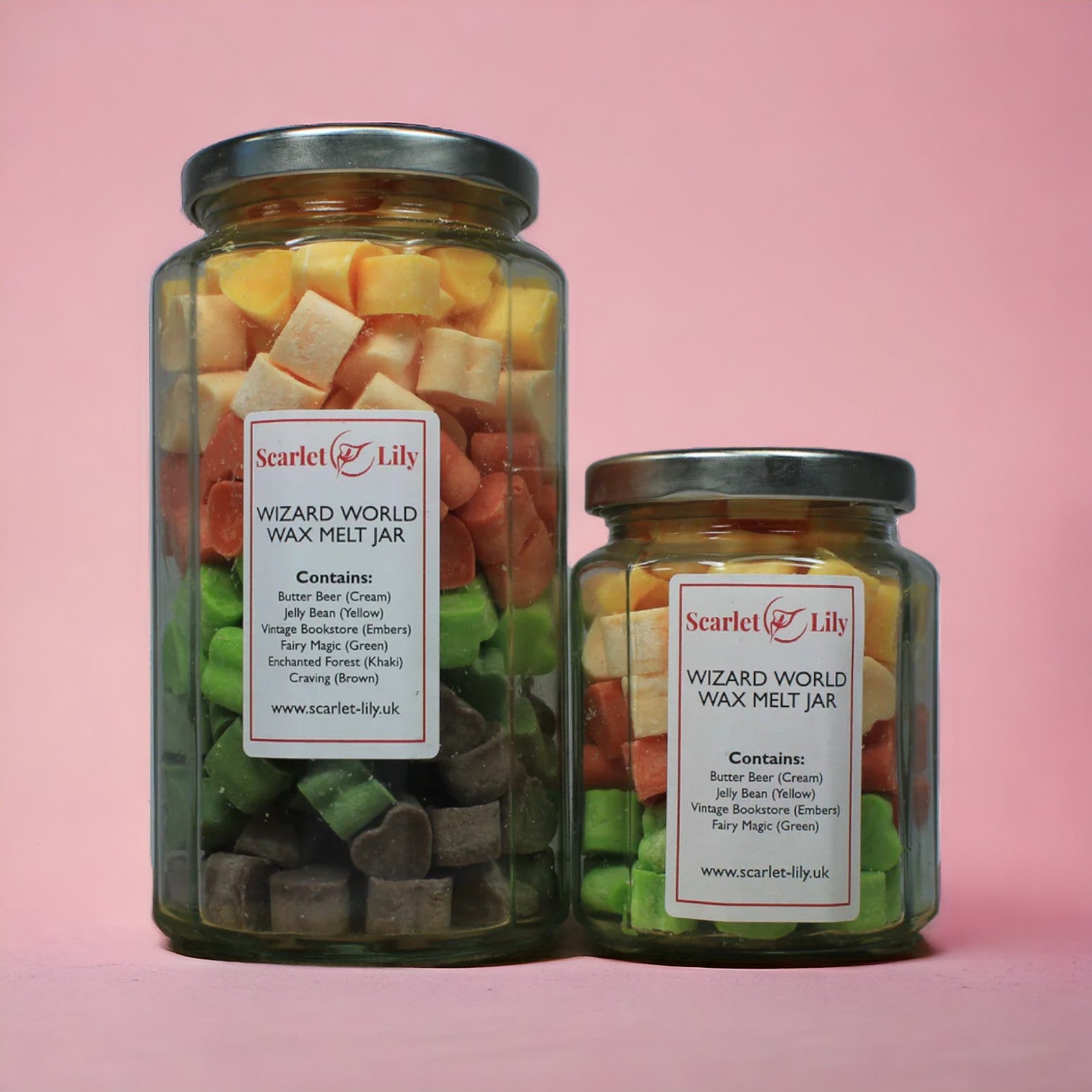 The large wizard's world jar contains all of the above fragrances plus Enchanted Forest (Khaki) and Craving (Brown).